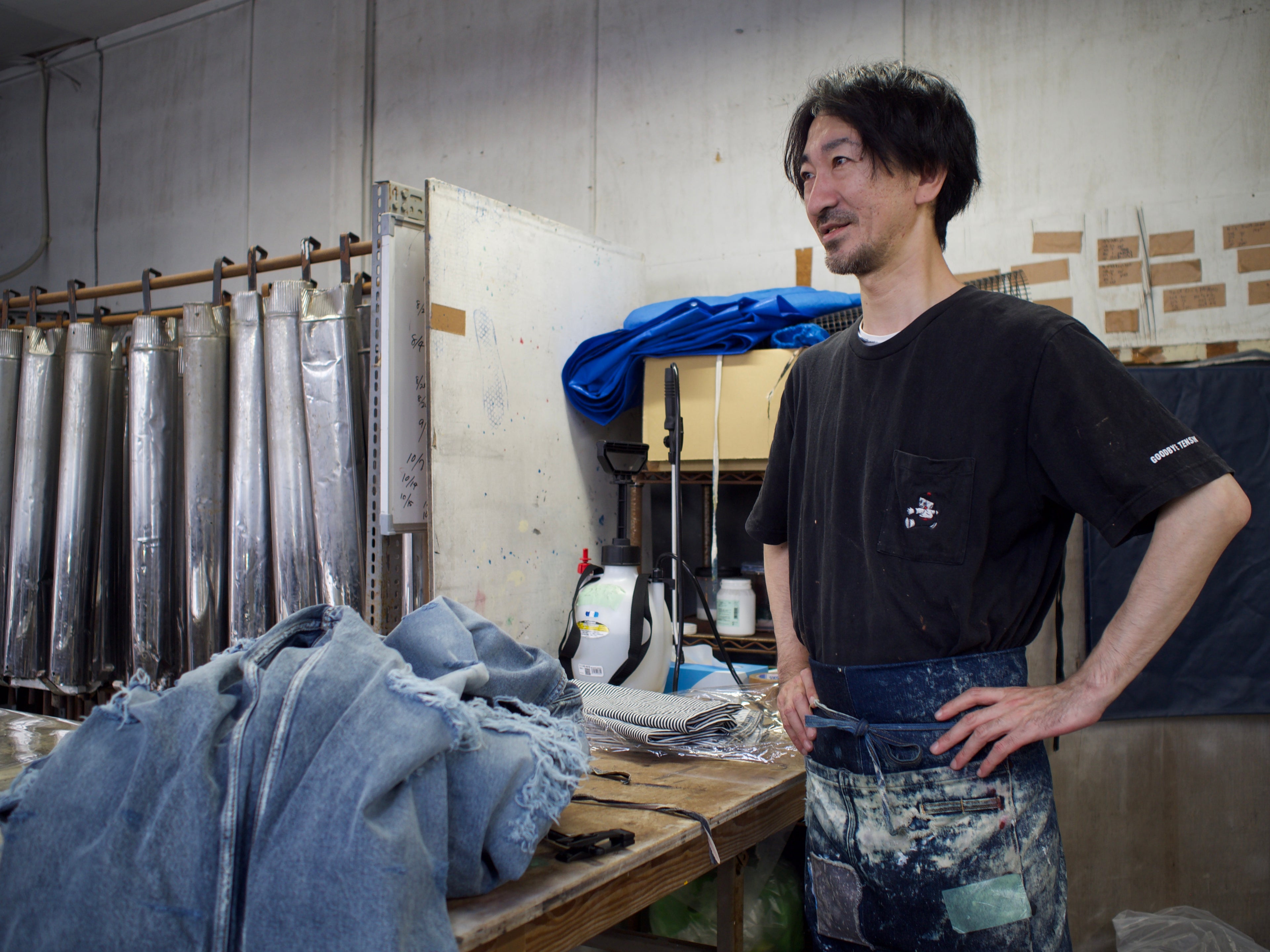 The reason why Kojima in Okayama Prefecture became the center of denim jeans production in Japan was because historically all the technical conditions for manufacturing denim fabric were in place. The technology for manufacturing thick cotton fabrics was inherited from canvas manufacturing, the technology for sewing thick cotton fabrics was inherited from tabi (socks) and school uniform manufacturing, and the technology for dyeing threads indigo blue was inherited from Bingo Kasuri, a traditional craft that has been practiced since the Edo period (1603-1868).